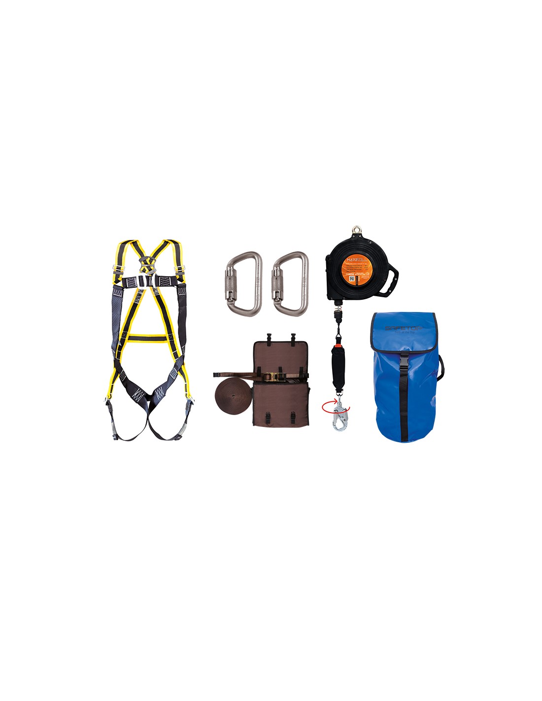 Kit integral de seguridad en altura para dos operarios, listo para usar con arnés, retráctil de cable y accesorios de alta resistencia.