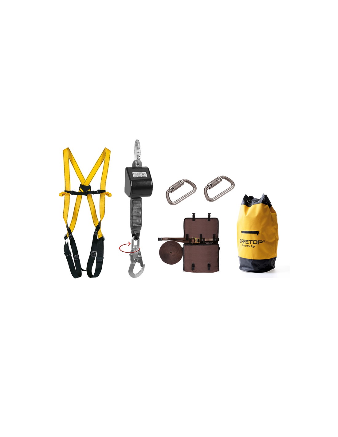 Kit completo de seguridad en altura que integra arnés Trevinca, retráctiles de cable y cinta, y mosquetones de acero para conexiones seguras.