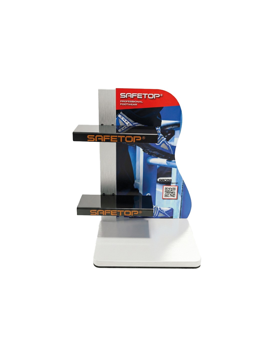 Expositor de sobremesa que maximiza la visibilidad del calzado Safetop en puntos de venta y mostradores. Medidas 450x300x250 mm y 2 modelos para una exhibición compacta, ordenada y de alta calidad.