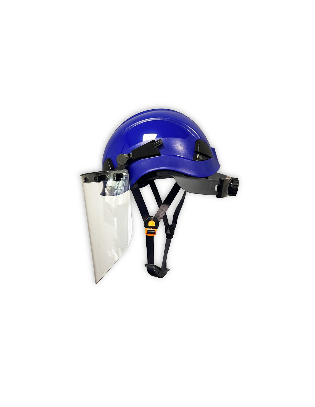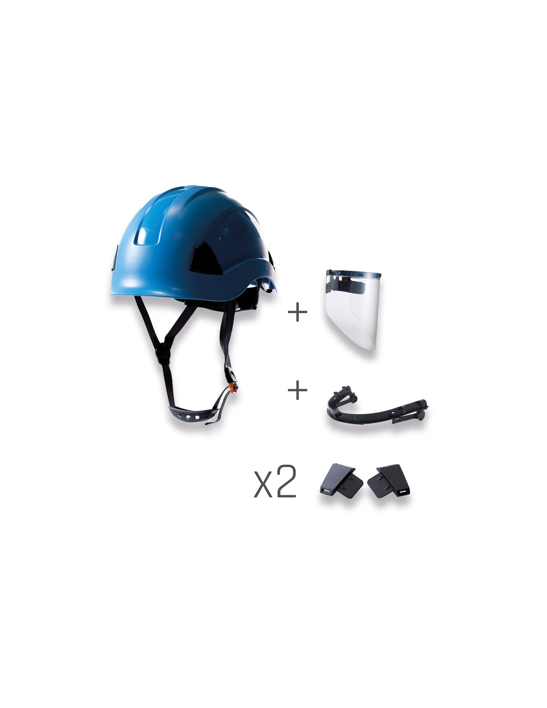 Kit dieléctrico integral para trabajos en altura y entornos eléctricos: casco 1000V, visera y sistemas de fijación compatibles.