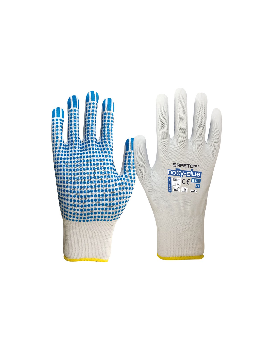 Dotty-Blue est conçu pour ceux qui ont besoin de performances constantes dans la manipulation à sec. Son tissu en nylon 13G sans couture offre un ajustement anatomique et léger, tandis que les picots en PVC sur la paume offrent une prise antidérapante et contrôlée, même sur de petites pièces. Le dos frais favorise la ventilation, maintenant la main à une température adéquate pendant de longues périodes.
