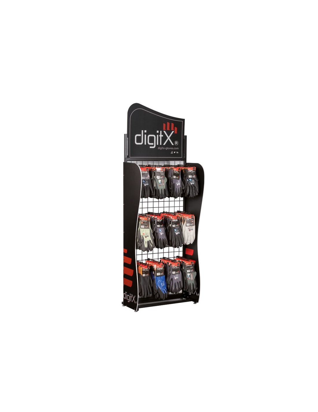 Compact and very stable floor display stand, designed to optimise the presentation of Digitx® gloves within a space of 1600x600x300 mm. Its 12 hooks, each with a 4 mm diameter, ensure secure and orderly holding, maximising product visibility. Optimise every metre of your point of sale with a floor display stand designed to perform: contained dimensions (1600x600x300 mm), great stability, and 12 hooks of 4 mm that ensure secure holding and order. Its vertical design enhances the visibility of the Digitx® range, facilitating customer selection and accelerating turnover. The quality of construction and specific compatibility with Digitx® gloves translate into a reliable and cost-effective solution for demanding professional environments. Usage suggestions: place it in high traffic areas or at the start of the PPE category; organise by size, model, or level of protection for quick reading; accompany it with clear signage and promotional packs to boost cross-sales. Display more, sell better. Use cases: - PPE shops and hardware stores: neatly presented by sizes/models for quick restocking. - Warehouses and dispatch areas: visible and stable picking point for everyday use gloves. - Showrooms and events: compact display that highlights the Digitx® range and facilitates demonstration.
