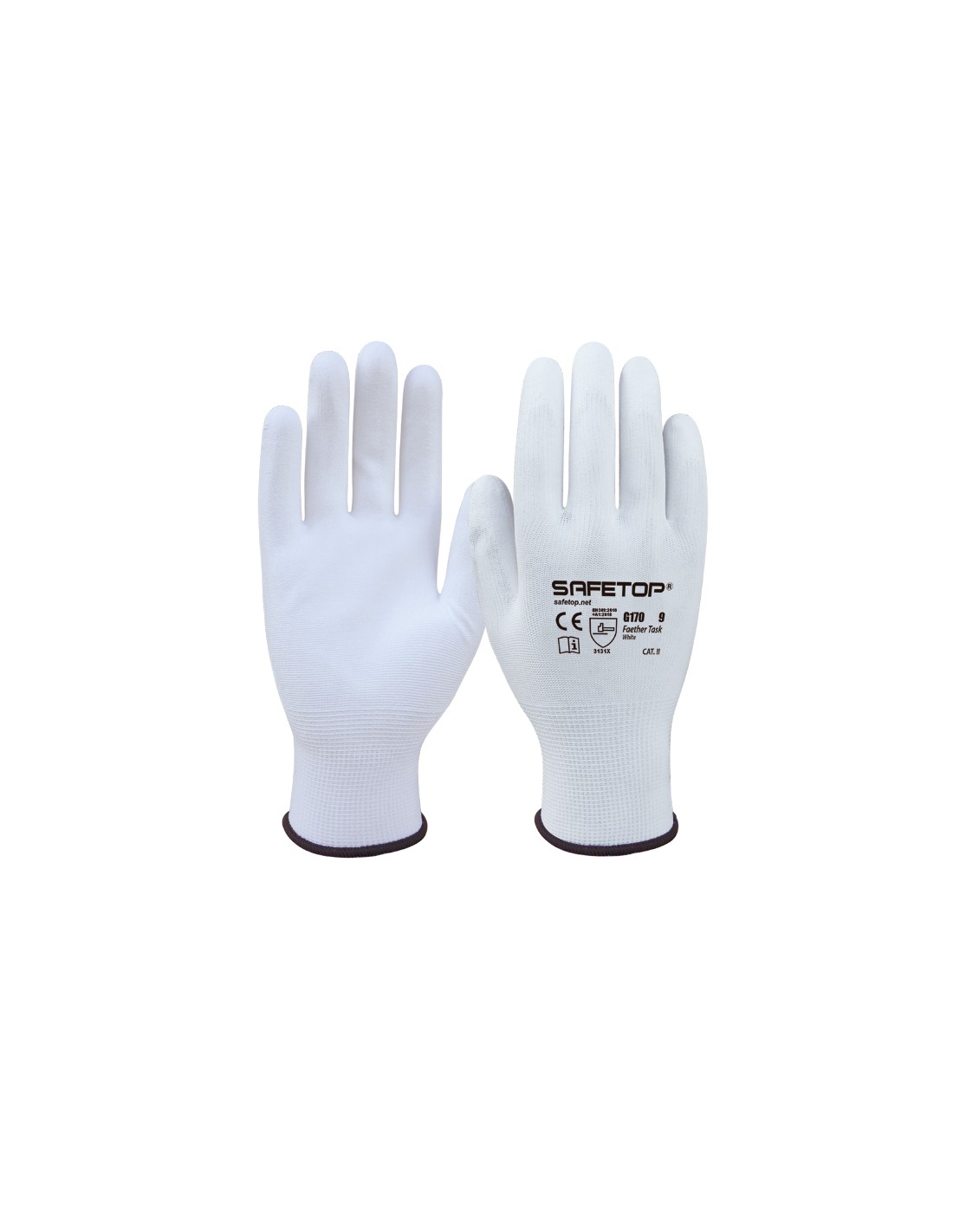 FEATHER TASK is designed for precision tasks where touch and control make the difference. Its seamless construction, with polyurethane coating on a polyester base, provides a snug and stable fit that prevents the intrusion of particles, without sacrificing comfort or breathability. With 0.8 mm thickness and level 5 dexterity, it allows handling of small pieces and tools with safety and agility. Selling points: ergonomics that adapt to the hand, elastic cuff for secure grip, and excellent value for money for equipment and fleets. Available in various colours (G170 white, G170B grey, G170N black) for coding by position or process. Usage suggestions: mechanics and maintenance, general handling, assembly and picking in warehouse. Lightweight protection, dexterity that performs.