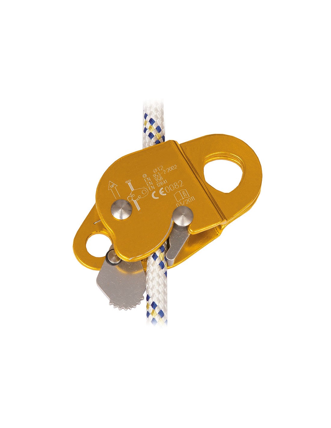 Ultraleggero (194 g) e accoppiabile in qualsiasi punto della corda, con meccanismi di bloccaggio e spostamento per massima sicurezza.
