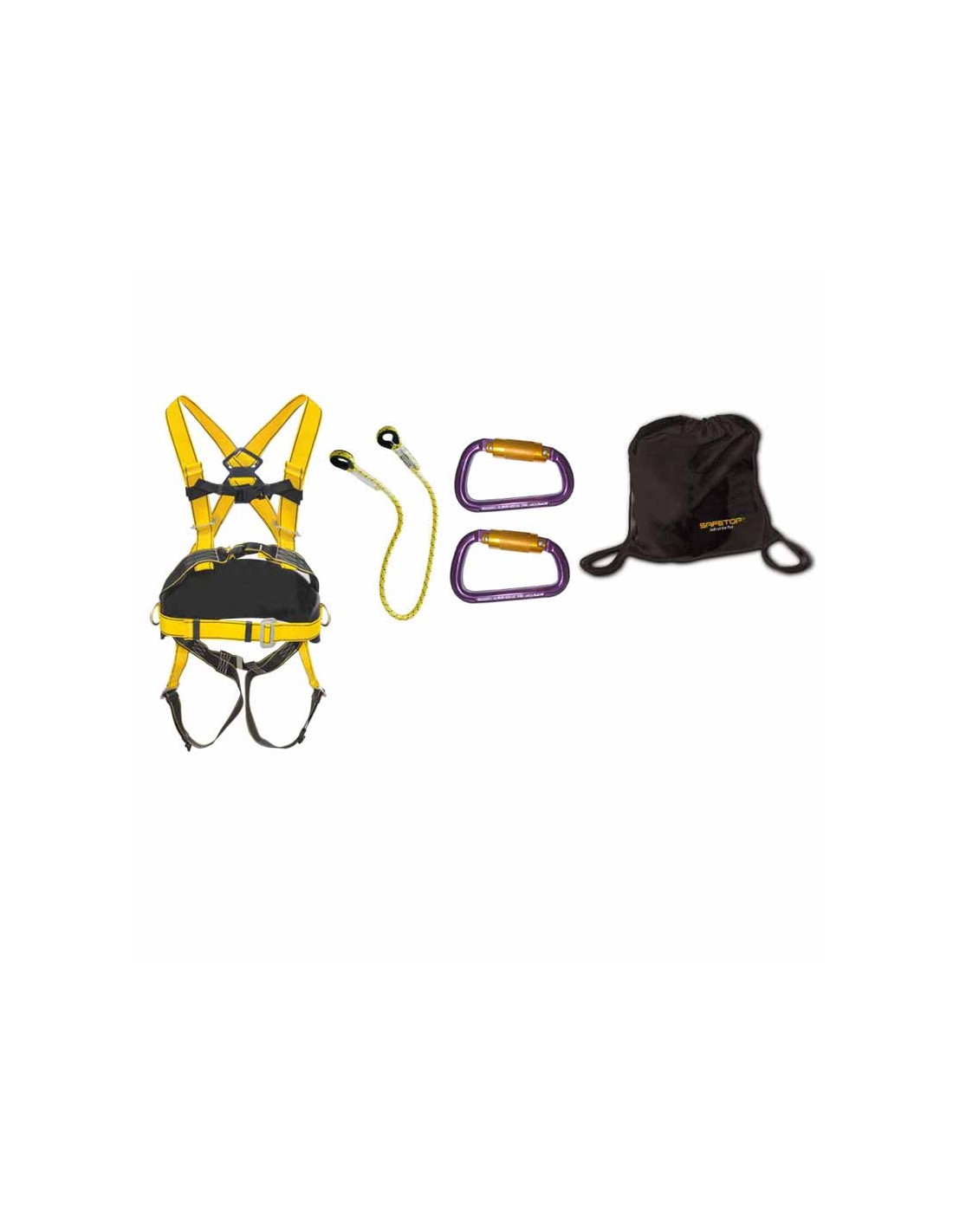 Kit integrale di sicurezza che combina imbracatura, corda di 1 m, due moschettoni in alluminio e zaino per un utilizzo pronto sin dal primo giorno.
