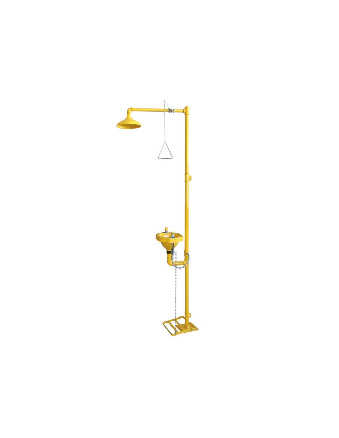 Proteção imediata contra salpicos e exposição química com duche de segurança e lava-olhos integrados.