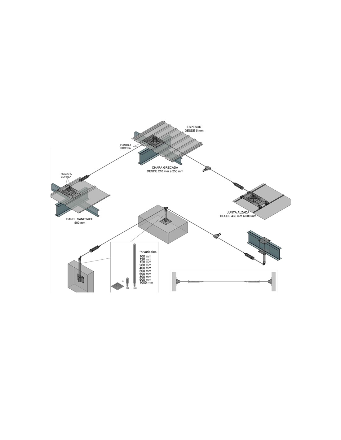 · Kit para suporte de qualquer cobertura metálica, independentemente da espessura (pode ser fixada com parafusos às correias metálicas da cobertura quando existem espessuras de chapa <0.6 mm) · Válido para até 4 utilizadores simultâneos · Montagem de cabo simples, unicamente com chave de 19 mm · Fornecido em kits de 10, 20 e 30 m para linhas de vida retas. · A linha de ancoragem pode ser fornecida opcionalmente com um dispositivo deslizante (Carro) · Válida para usar como cordão de segurança (EN354)