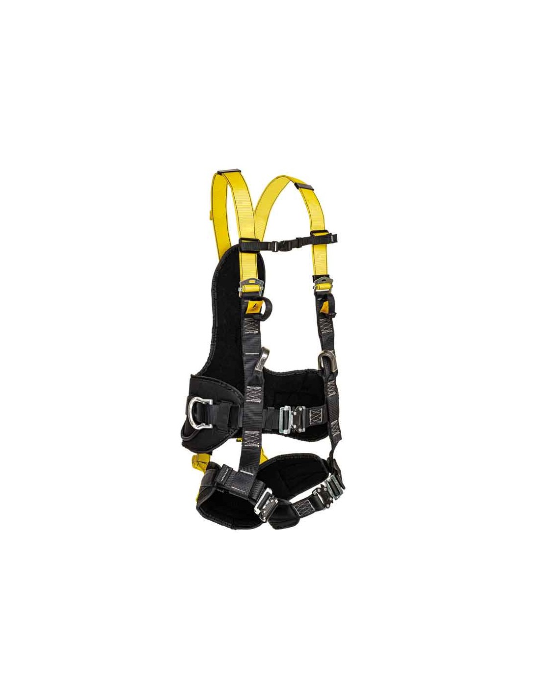 Ergonomin märks i den ryggdyna, vadderade benremmar och justerbara midjebältet, som bättre fördelar lasten och minskar tröttheten under långa arbetspass. De laterala ringarna och verktygshållare optimerar hanteringen av utrustning, och de sex upphängningspunkterna utökar insatsmöjligheterna.
